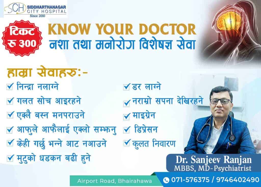विगत लामो समयदेखि वि.पी.कोइराला स्वास्थ्य विज्ञान प्रतिष्ठान, युसीएमएस भैरहवा लगायत अन्य अस्पतालहरुबाट अनुभवप्राप्त डा.संजिव रंजनका अनुसार पछिल्ला वर्षहरूमा तनाव, चिन्ता, डिप्रेशन, न्युरोसिस, सिजोफ्रेनिया, बायपोलार डिसअर्डर जस्ता मानसिक समस्याहरू तीव्र रूपमा बढिरहेको देखिन्छ ।